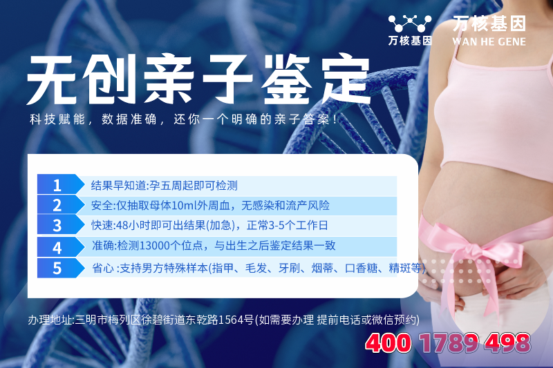 在进行三明上户口亲子鉴定时,选择一个正规的鉴定机构来确保的准确及权威性。三明万核医学检测中心,目前联合了多家权威法医物证司法鉴定及基因检测公司的亲子鉴定服务咨询机构。,我们在全国范围内设有亲子鉴定分部受理点及联系方式,为国内外客户提供专业权威的亲子鉴定服务。我们提供办理亲子鉴定、个人亲子鉴定、移民亲子鉴定、上户口亲子鉴定、亲缘亲子鉴定、孕期亲子鉴定(孕期五周即可检测,安全放心,全国覆盖),国内通用的正规亲子鉴定机构。